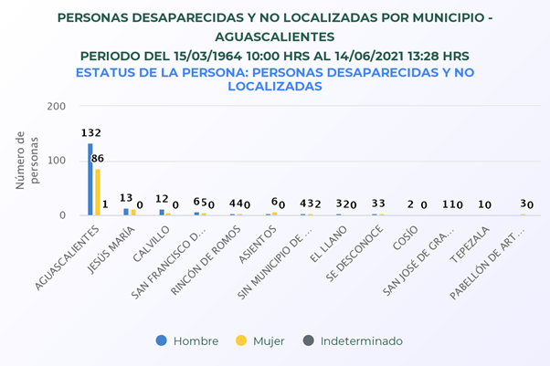 La capital es el municipio con mayor incidencia, seguido del municipio de Jesús María y en tercer lugar Calvillo. Los años con mayor número de desapariciones han sido 2007, 2011, 2015, 2018 y 2020.