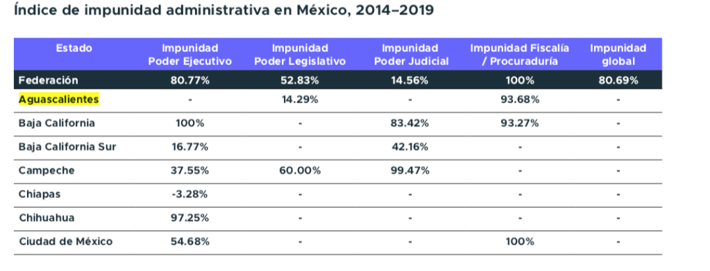 De acuerdo con el estudio “La impunidad administrativa en México” publicado en agosto de este año por la organización civil Impunidad Cero; Aguascalientes y Baja California son dos de las entidades en el país con el mayor índice de impunidad administrativa en sus fiscalías, con 93.6% y 93.2%, respectivamente.