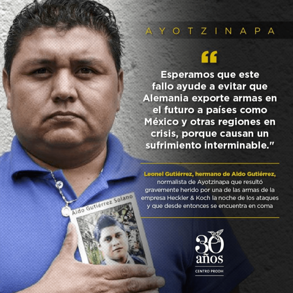 Un arma fabricada por esta empresa, revelaron en su momento las investigaciones del caso, fue la responsable de causar las heridas de Aldo Gutiérrez Solano, normalista que continúa en estado mínimo de conciencia. Tenía 19 años al momento del ataque coordinado entre agentes del Estado y grupos del crimen organizado.
