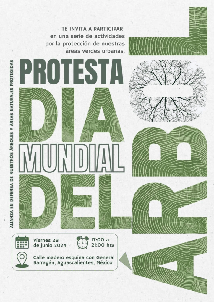 Este pasado lunes 24 de junio, la Alianza por la Defensa de Nuestros Árboles y Áreas Verdes de Aguascalientes, hizo un llamado a la sociedad civil para participar de la manifestación pacífica con motivo del “Día del árbol”, que se llevará a cabo el próximo viernes 28 de junio a las 5 p.m. en la Av. Fco. I. Madero esquina con Gral. Miguel Barragán, en dirección a Plaza de la Patria; el objetivo de la acción política es la exigencia de atención inmediata a áreas verdes que requieren de mayor supervisión y preservación como lo son La Pona, El Malacate, El Bosque de Cobos, entre otros.