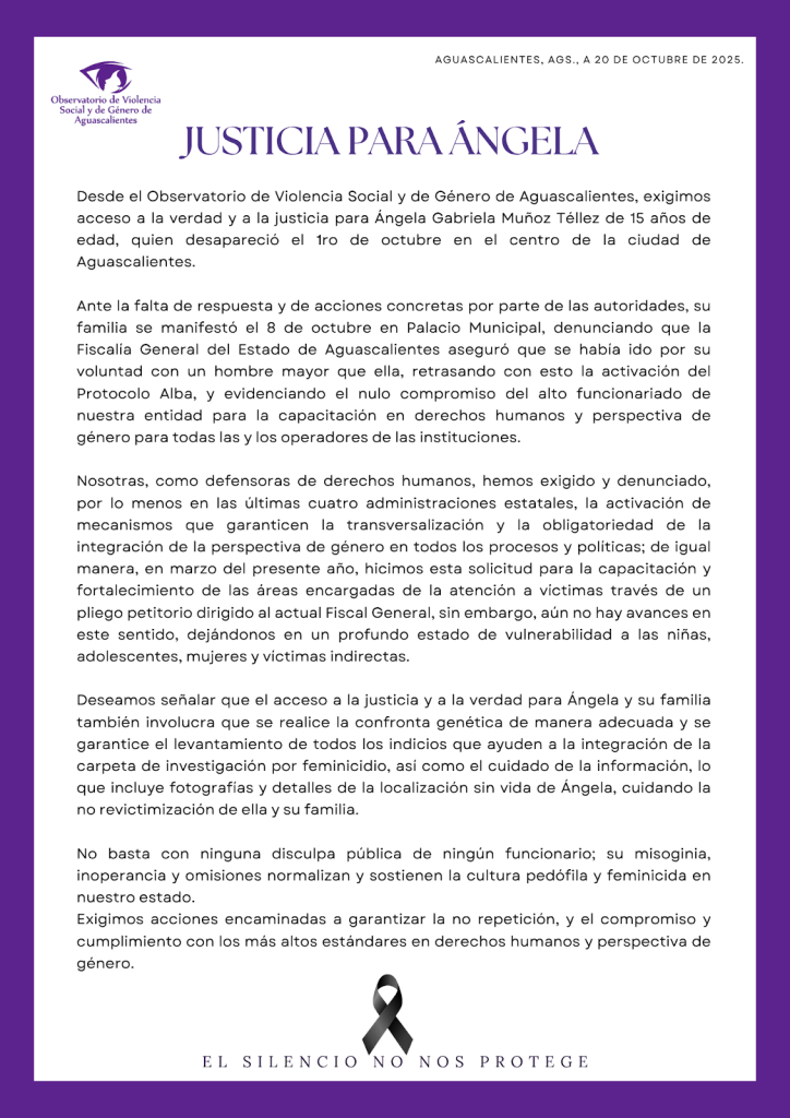 Ángela fue localizada sin vida y con huellas extremas de violencia en el municipio de Tequisquiapan, en el estado de Querétaro. Durante su búsqueda, su madre y familia exigieron la localización inmediata, y se manifestaron el pasado 8 de octubre frente a palacio de gobierno tras las declaraciones revictimizantes de personal de la Fiscalía General del Estado, quien le habría asegurado a la familia que se había ido por su voluntad. Días después, la Fiscalía ofreció disculpas por estas declaraciones. Cabe mencionar que, aunque se contaba con ficha de búsqueda emitida por la Comisión Estatal de Búsqueda de Personas del Estado de Aguascalientes, la Fiscalía activó el protocolo Alba y emitió la ficha hasta que la familia se manifestó.